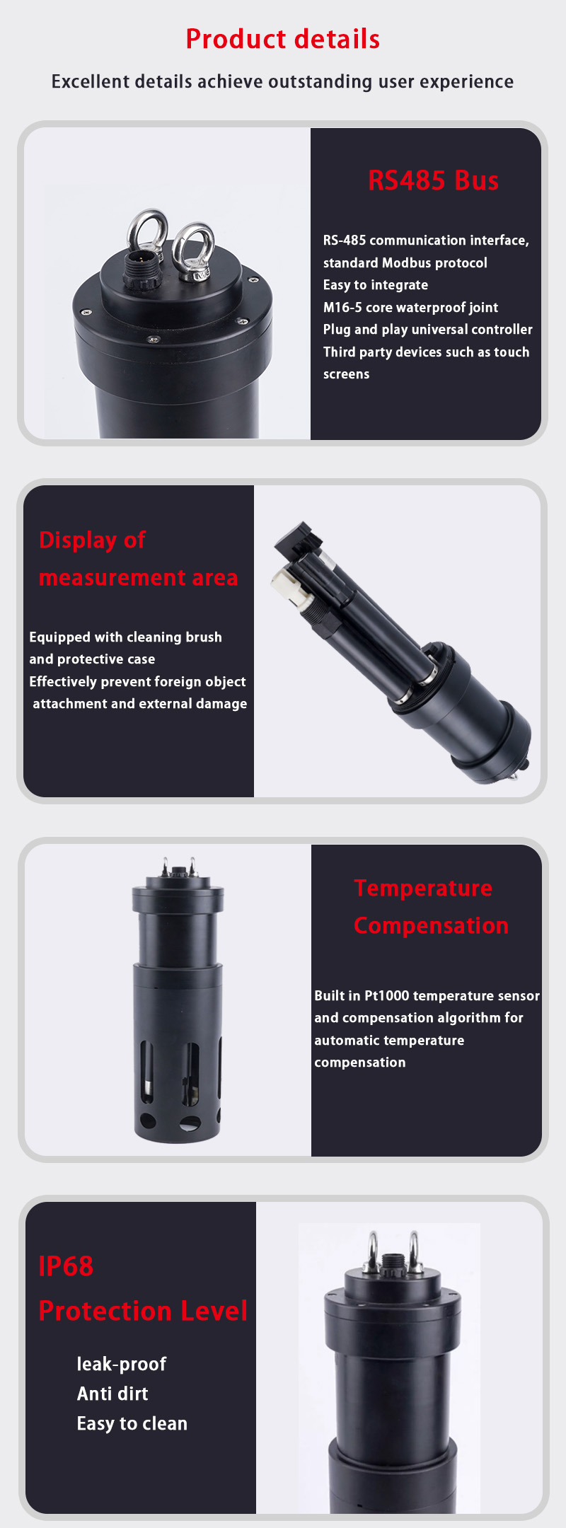 Dank seiner industrietauglichen, wasserdichten Konstruktion (IP68) und der Verwendung korrosionsbeständiger Materialien ist es für den Dauerbetrieb in anspruchsvollen Wasserumgebungen (z. B. Abwassertanks, Küstenaquakulturen) mit minimalem Wartungsaufwand geeignet.